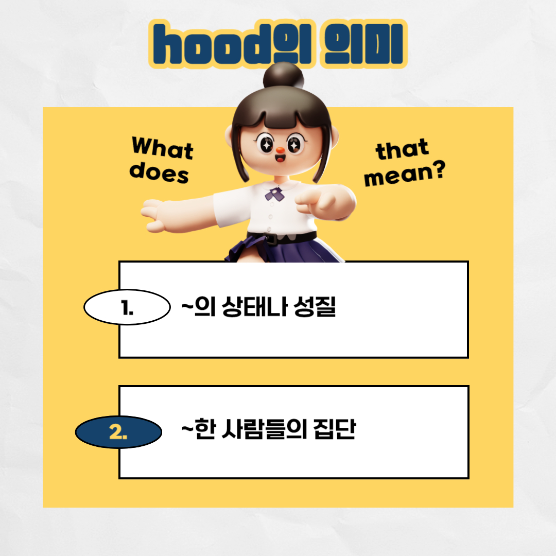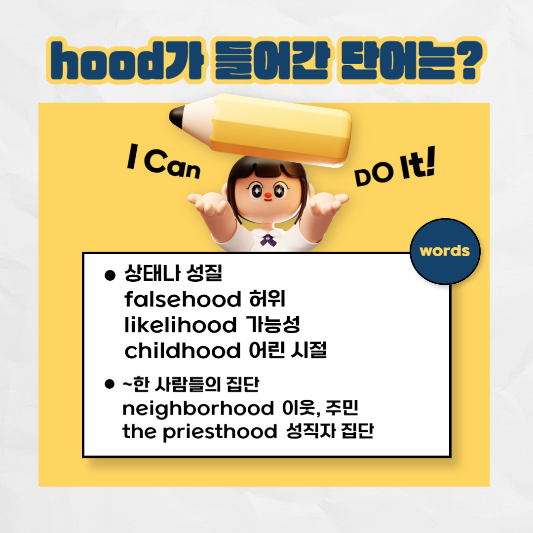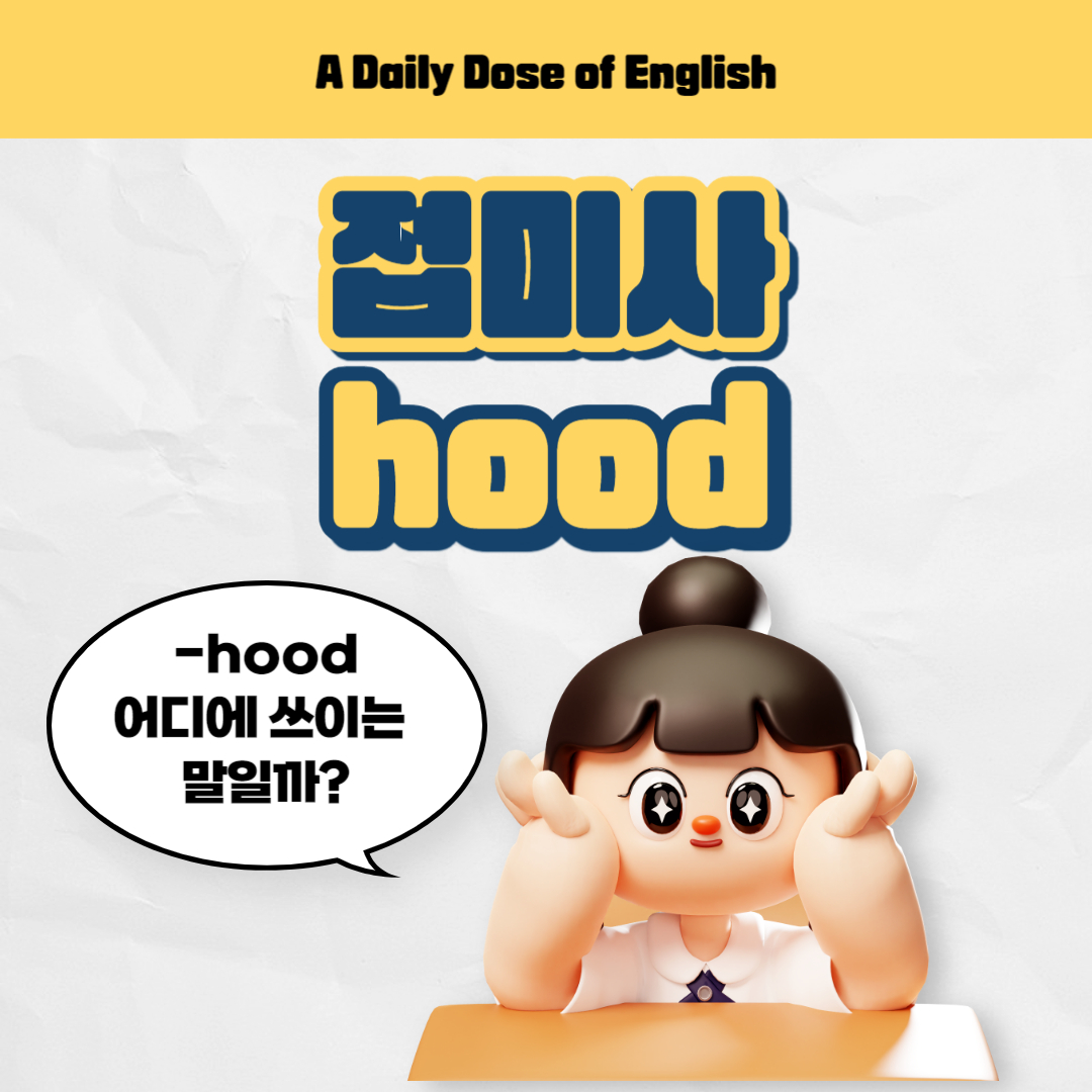 오늘의 접미사 hood가 들어간 영어 단어 5개, 모두 금방 머리 속에 쏙쏙 넣으셨죠?